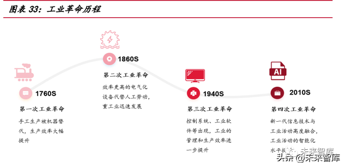 物联网推动第四次工业革命,带领我们进入智能时代。我们总计经历 4 次工业革 命。从 1760 年机器代替手工的蒸汽时代,到 1860 年电气化设备代替人工劳动的电 力时代,再到 1940 年控制系统、计算机诞生所带来的信息时代;2010 年第四次工业 革命,信息技术与工业高度融合推动我们进入工业智能时代。物联网作为第四次工业 革命的主要技术之一,与各行各业深度融合,物联网产业链相关公司将核心受益于第 四次工业革命。
