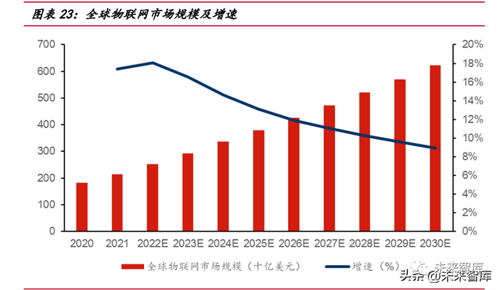 全球物联网市场空间广阔,市场规模增长稳定。据 Statista 网站统计,2021 年全球物联网市场规模为 2131 亿美元,同比增长 17.41%。预计 2021-2030 年,全球 物联网市场规模增长 191.69%,达 6216 亿美元,CAGR 为 12.63%。