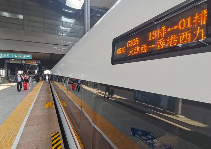 2023年4月1日11:05,天津西至香港西九龙G305次列车从天津西站发车,这是2023年首趟天津开往香港的高铁列车。