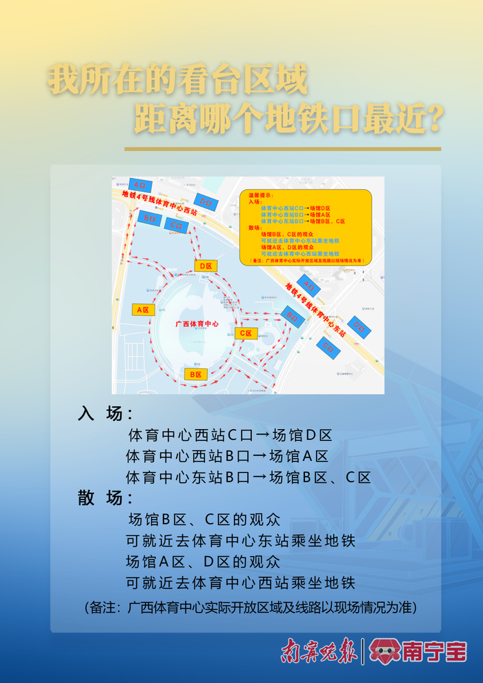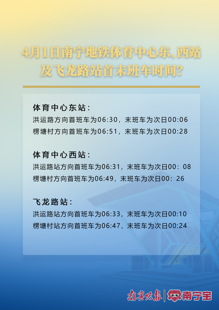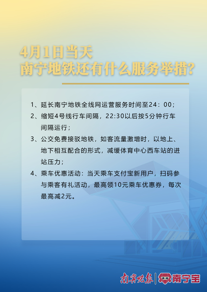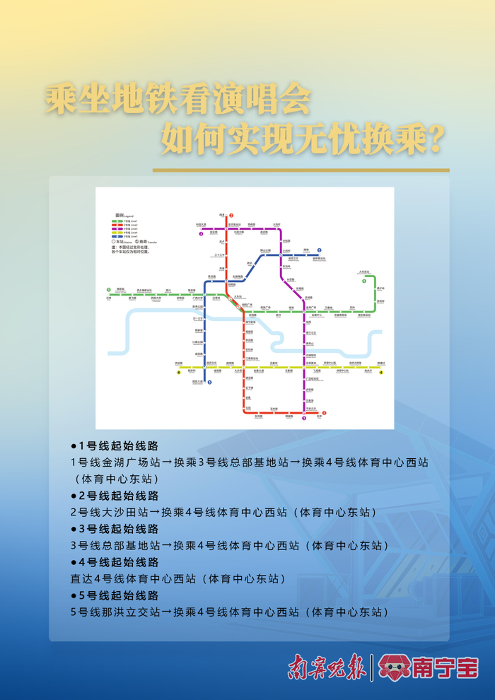 4月1日,广西体育中心有一场大型演唱会,去演唱会现场地铁如何换乘?当日地铁运营时间和末班车时间是几点?哪些公交车可抵达广西体育中心?对此,记者从南宁轨道交通集团进行了了解。