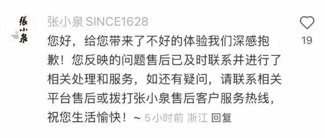 3月29日,张小泉官方账号在该条网帖下回复称,“给您带来了不好的体验我们深感抱歉,售后已及时联系并进行了相关处理和服务。”