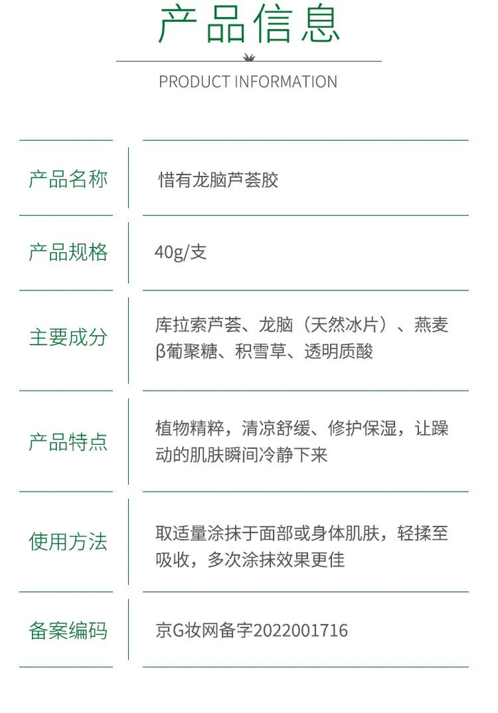 说回到成分上,这款龙脑芦荟胶的主要有效成分是龙脑和芦荟,辅料是燕麦、积雪草天然提取物。