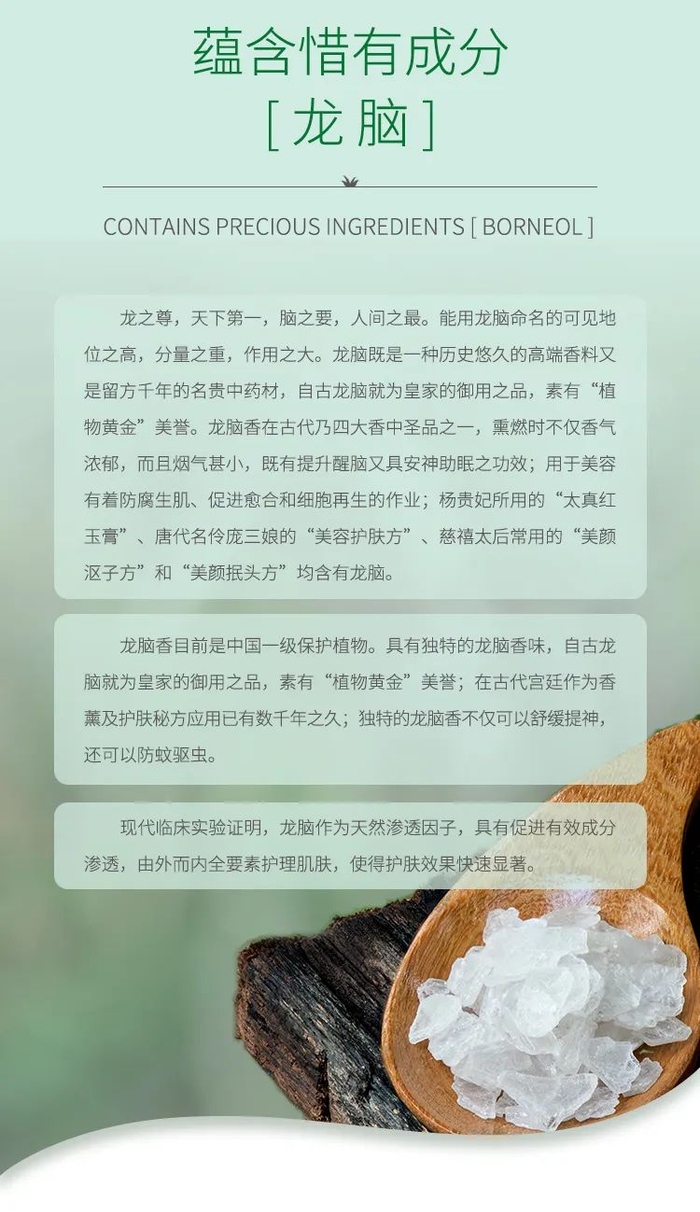 冰片(龙脑)主要是起镇定和修护作用,因为太过于稀少,所以很多产品都用人工合成的。