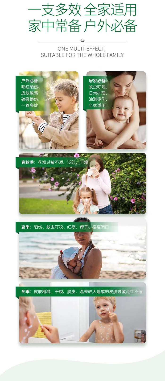 像一些晒后修护、蚊虫叮咬,补水保湿、缓解过敏不适,小的擦伤、烫伤,小孩,大人都能用!