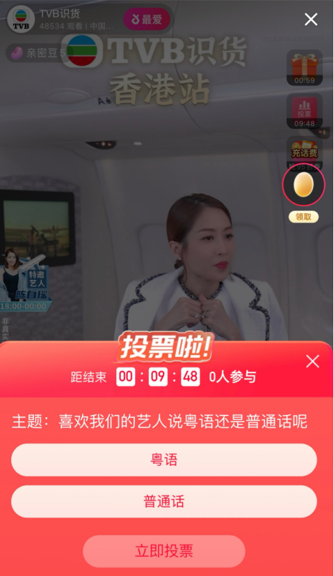 同时,不少网友们注意到,与其他直播间不同,TVB直播间会频繁跳出一个投票,“你喜欢主播用粤语还是普通话直播?”