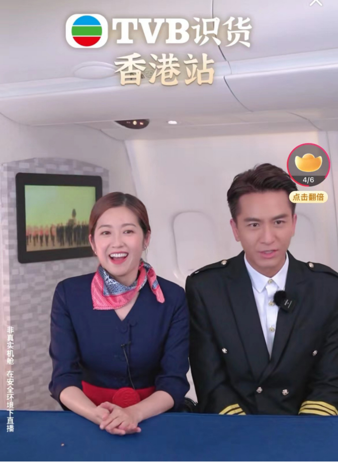 首播时,宣传上主打“港剧带货”,但置景只是匆忙地在绿幕上贴背景图。这场直播以TVB经典剧目《冲上云霄》为主题,直播间设立在TVB位于香港将军澳的电视广播城,实体还原了当年拍摄《冲上云霄》的机舱拍摄场景,选择的艺人主播也是剧中的演员:马国明、陈敏之和陈自瑶,真正实现在“淘宝直播间”看港剧。