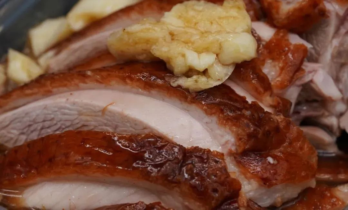 松枝烤鸭红润油亮,鸭皮脆香无比、鸭肉酥烂软香,口齿间透露出一股淡淡的松枝清香。松枝烤鸭于光绪四年研制而成,距今已有两百年历史,运漕松枝烤鸭制作技艺入选马鞍山市级非物质文化遗产名录。