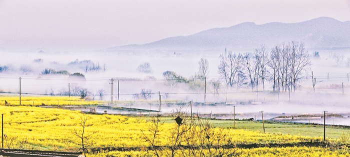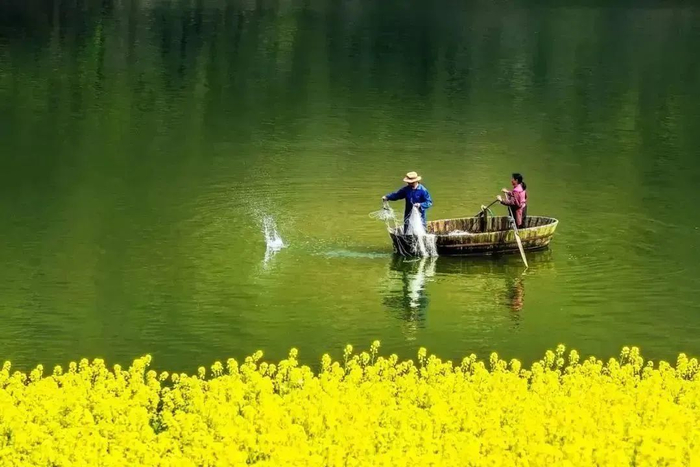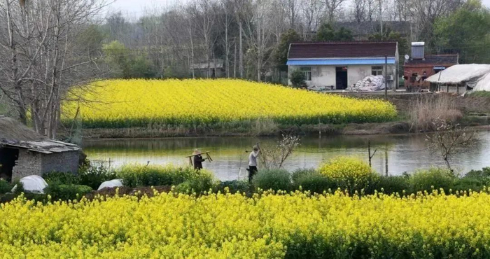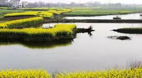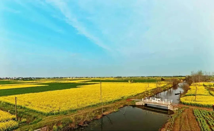 金黄的花影,泛着星星点点的光芒,仿佛阳光倾撒在大地。油菜花与杨柳圩内的田园、湿地、村庄相映成趣。在这里,蓝天、碧水、民居,织就一幅璀璨的奇丽画面。
