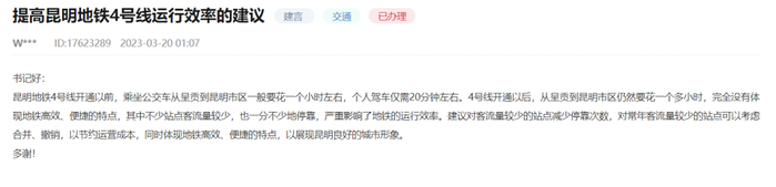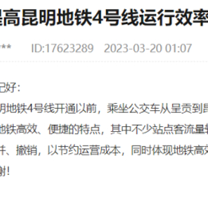 网友建议减少昆明地铁4号线客流量较少站点停靠次数,官方回复