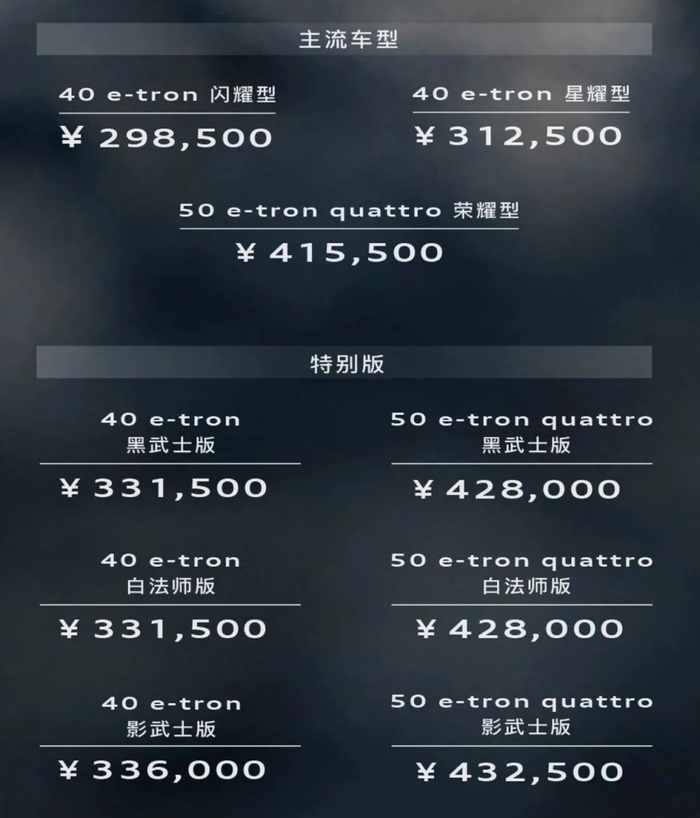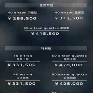 在配置方面,新增的40 e-tron闪耀型相比中配的40 e-tron星耀型,配置上缩减了矩阵式LED大灯(改为普通LED灯组)、前排座椅加热、20英寸轮辋(改为19英寸)、灰木饰板(改为素黑磨砂饰板),同时减少可选装配置。新增黑武士版、白法师版、影武士版,分别采用专属对应外观车漆——达摩黑、李白带黑车顶、诸葛灰带黑车顶,标配21英寸RS雷影轮辋,内饰采用带红色缝线的黑色Fine Nappa真皮座椅,搭配菱格亮光铝饰板,其它配置则与对应的星耀型、荣耀型相当。