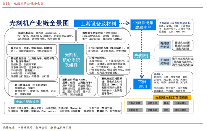 光刻机产业链主要包括上游设备及配套材料、中游光刻机系统集成和生产及下游光刻机应用三大环节,技术极为复杂,涉及系统集成、精密光学、精密运动、精密物料传输、高精度微环境控制等多项先进技术,部分机型所需的零部件更是多达数十万件,因此光刻机的生产通常涉及上千家供应商。
