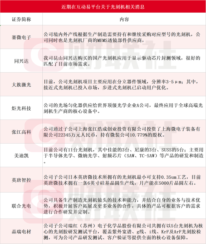 此外,据财联社不完全整理,近期在互动易平台回复光刻机相关业务的上市公司包括赛微电子、大族激光、炬光科技、张江高科、联合光电、晶瑞电材、英唐智控、美迪凯、同兴达等。