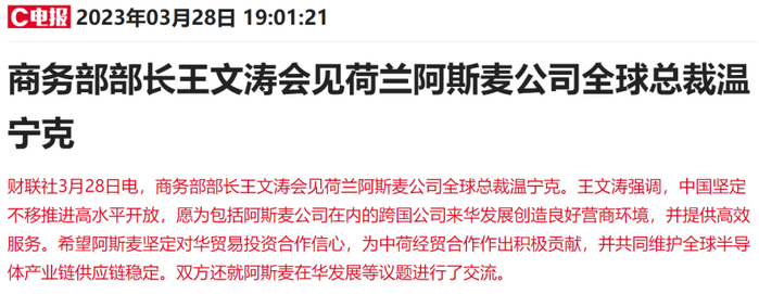 消息面上,商务部部长王文涛近日会见荷兰阿斯麦公司全球总裁温宁克,双方还就阿斯麦在华发展等议题进行了交流。