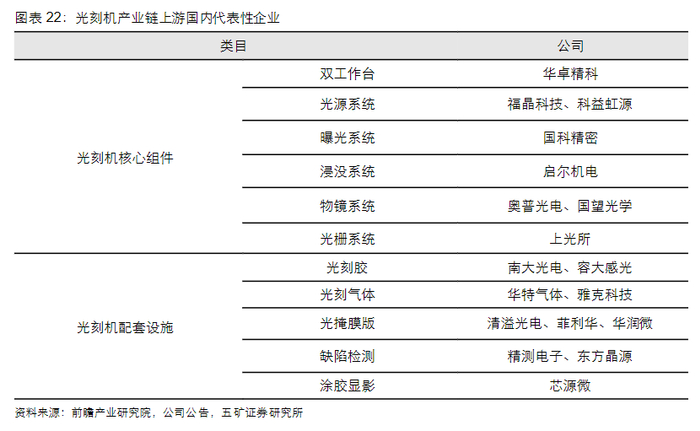 其中,光刻机上游国内代表企业包括福晶科技、奥普光电、南大广电、容大感光、华润微、精测电子、芯源微、菲利华、清溢光电、茂莱光学、美埃科技等。