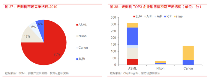 光刻机市场集中度高,ASML、Nikon、Canon市场占有率超过90%,其中ASML由于其技术领先,垄断了EUV光刻机,独占75%的市场份额,Nikon与Canon分别占据13%和6%的市场份额。ASML的光刻机技术在全球处于绝对领先地位,EUV领域ASML市占率为100%,ArFi、ArF领域市占率分别高达96%、88%。