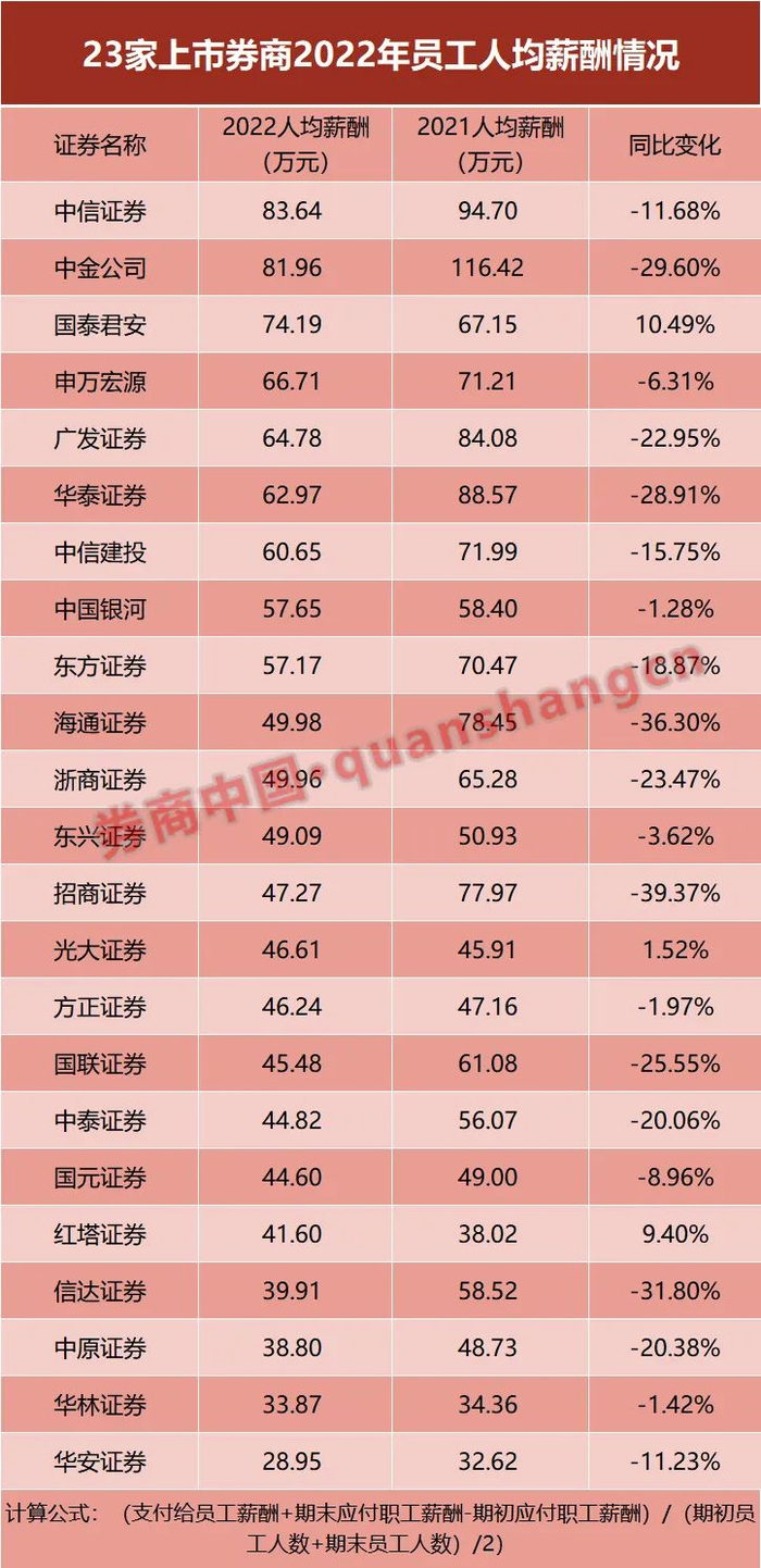 券商中国记者以“(支付给员工薪酬+期末应付职工薪酬-期初应付职工薪酬)/(期初员工人数+期末员工人数)/2)”公司来计算员工人均薪酬,截至4月1日,23家披露2022年报的上市券商中有87%的证券公司员工人均薪酬减少。