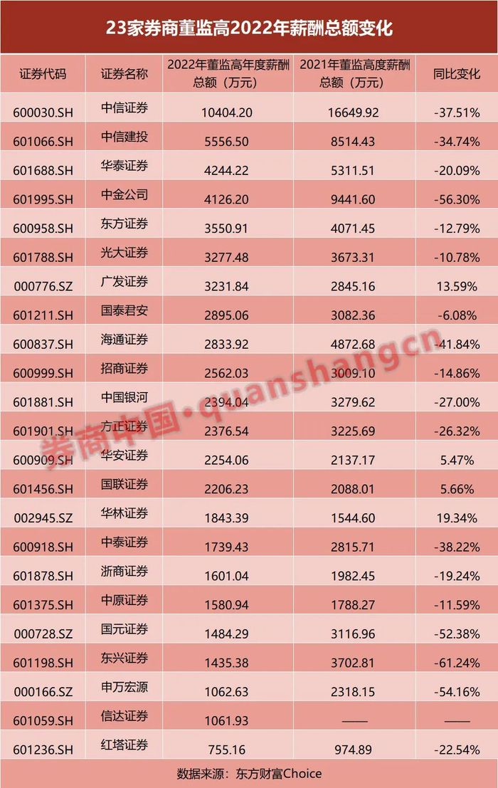 随着时间步入4月,截至4月1日,已有23家上市券商披露2022年年报,占比超过一半。除国信证券以外,多家大型券商均已披露完毕,有关“券商降薪潮”的数据也浮出水面。
