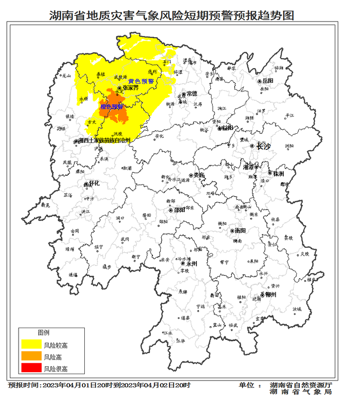 根据地质灾害成灾规律和孕灾条件,结合2023年4月1日短期气象预报情况,省自然资源厅与省气象局联合会商得出如下结论:自4月1日20:00至2日20:00,受强降雨影响, 湘西北部分区域发生突发性地质灾害风险高(橙色预警),湘西北大部分区域发生突发性地质灾害风险较高(黄色预警)。