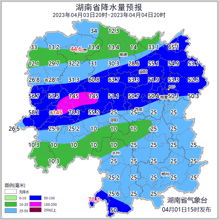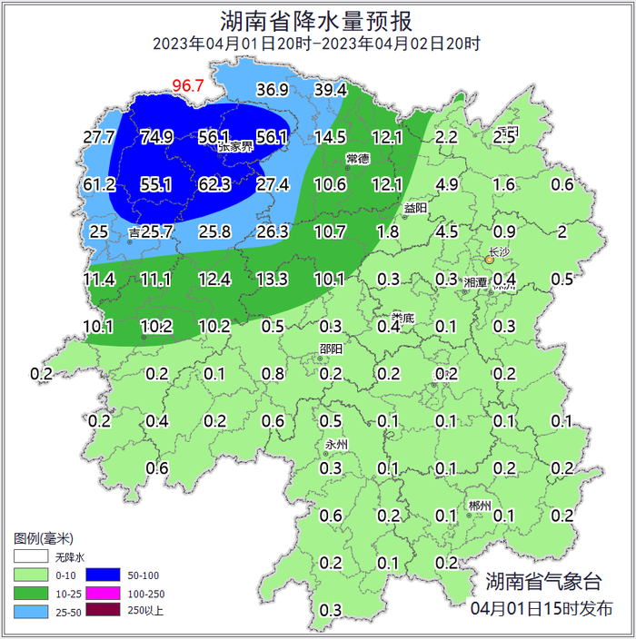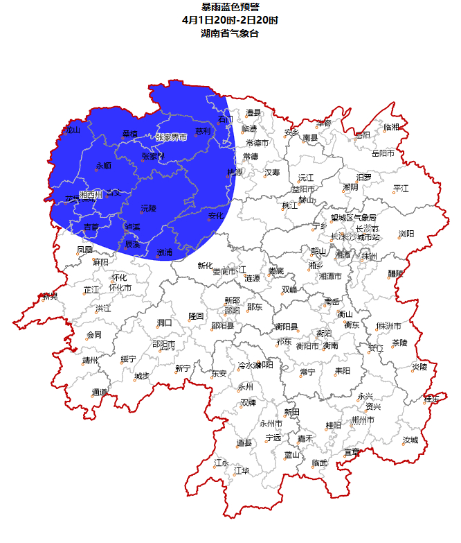 根据湖南省气象台2023年4月1日短期气象预报情况,湖南省水利厅与湖南省气象局联合会商得出如下结论:自4月1日20:00至2日20:00,受降雨影响,常德市西部、张家界市、怀化市北部、湘西自治州东部等局地可能发生山洪灾害(蓝色预警),其中,张家界市南部、怀化市、湘西自治州等局地发生山洪灾害的可能性较大(黄色预警)。