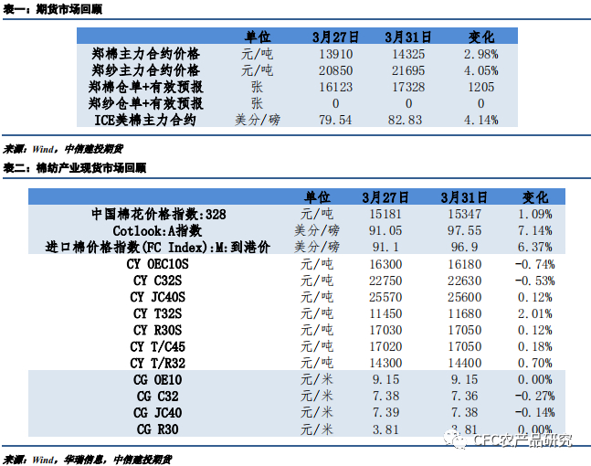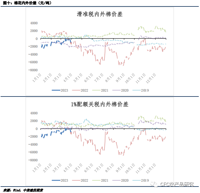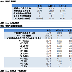 此外,USDA发布一年一度prospective plantings报告,较2月展望论坛的调整符合近期美盘粮棉比走势,全美棉花种植面积预估为1125.6万英亩,是自2017年以来最低的三月面积预估,较2月预估上修35.6万英亩,较去年三月报告预估同比减少7.99%。美国棉区以得州为主,棉花竞争作物关注小麦,小麦和棉花比价处于较高水平,但比价仍处于历史区间范围内,预计美棉种植面积的缩量已经充分反馈,后续关注实际播种情况和天气扰动对弃种率的影响。