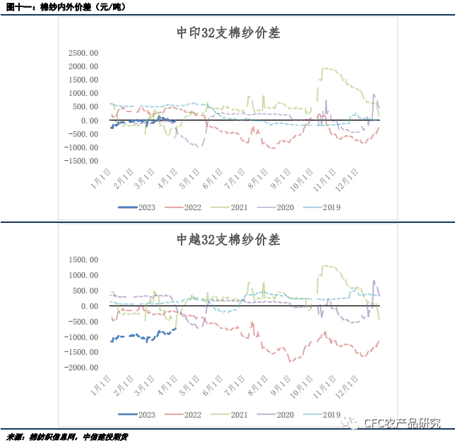 不过,在如此产销顺畅的时期,纯棉纱厂的原料库存采购依然维持谨慎,控制在往年同期中等水平,另外从纺纱利润来看,在国内内销终端市场火热、产成品走货顺畅之际,纺纱利润恢复却极为有限。此外,整体棉纱库存呈现升高趋势,这也说明棉纱的采购更多来自于贸易商的行为,棉纱正在渠道库存淤积而非消化。如此状态说明目前行情依然难言乐观,并非因产业链自下而上地由终端消费恢复带来的在利润驱动行情。本质来看,在外贸形势没有改善的情况下,棉纱行情属性还是在于产业链上下游对于价格的博弈和利润的再分配,随着金三银四旺季过去,下游订单转弱,将对囤货的棉纱贸易商和扩锭的中小型纱厂形成考验。