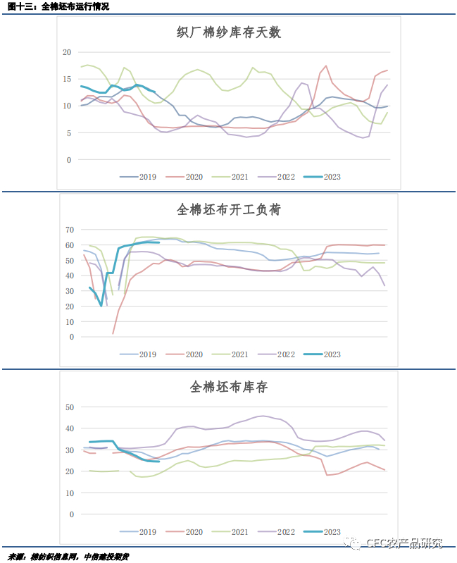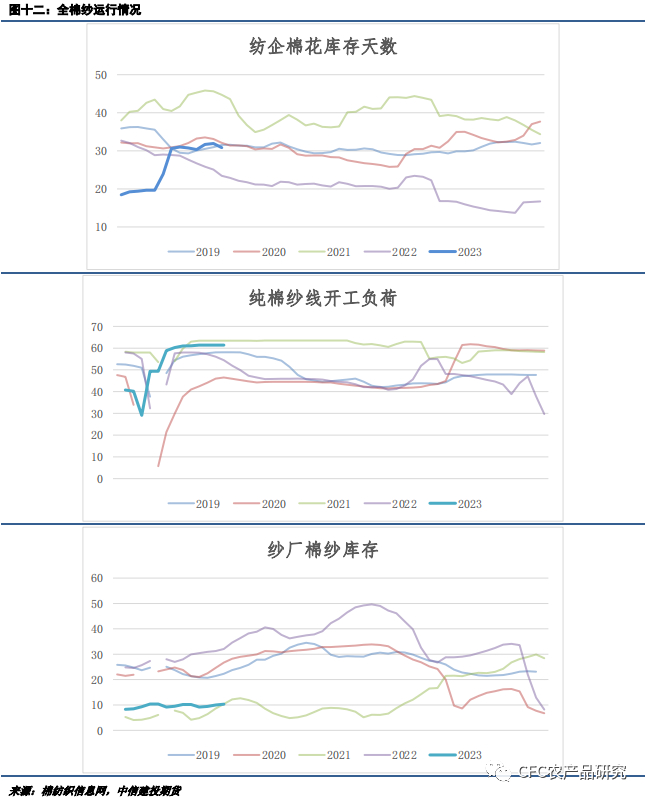 目前棉纱供应维持高位,但产销较为顺畅。根据对纺机销售调研,随着防疫政策优化,内地不少中小型纱厂信心有所恢复,纷纷完成扩锭扩产能。而相关市场数据表示,目前纱厂处于高开工、低成品库存的状态,仅次于2021年同期水平。随着节后复工复产,纯棉纱开工负荷逐渐提高,目前周度开工负荷处于61.4%的高位水平,而从成品库存来看,纯棉纱厂的产成品库存在节后继续控制在10天左右。