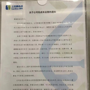 通知还显示,目前上药康希诺仅保留少量人员维持运营,其他人员无须到岗,工资正常支付一个月,此后按最低标准支付。
