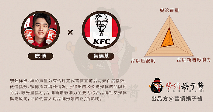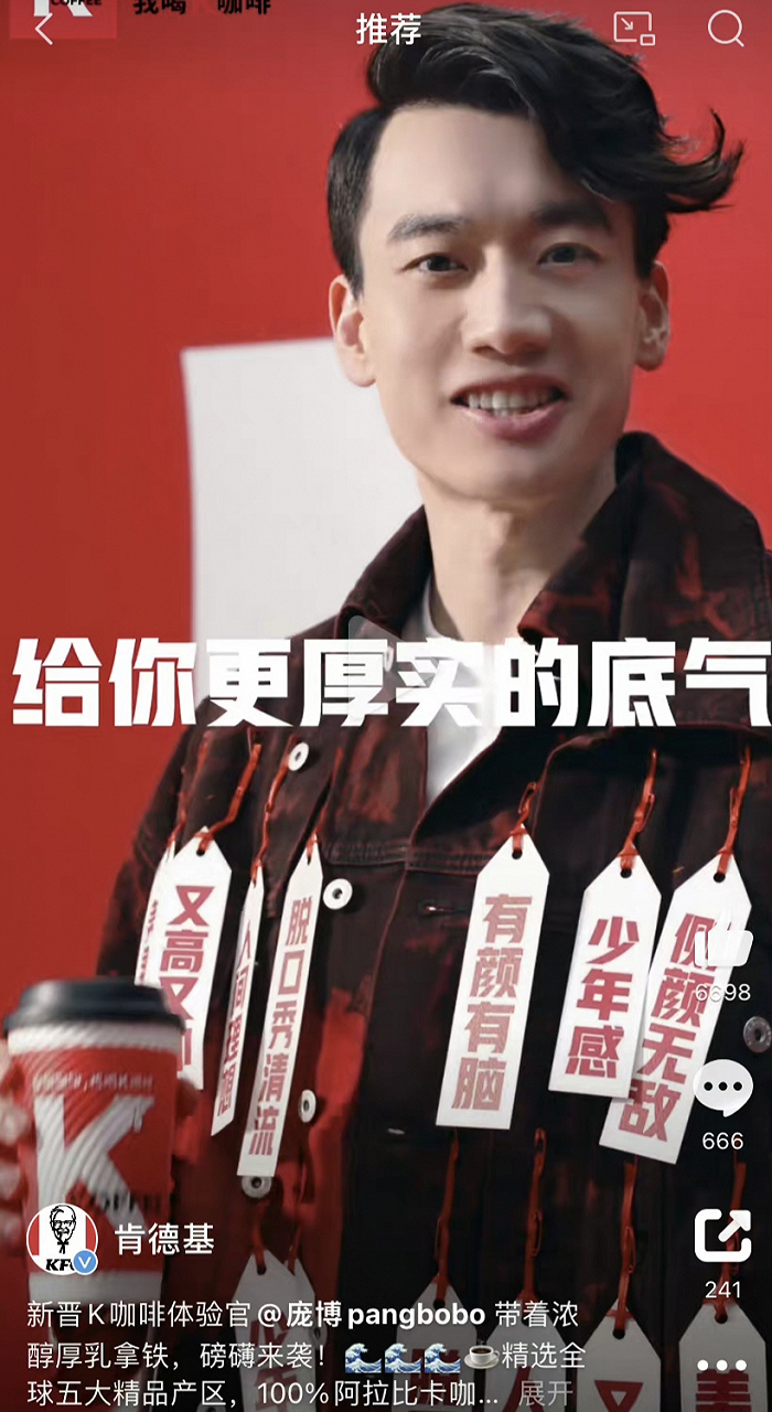 3月6日,肯德基官宣庞博为新晋K咖啡体验官。在官宣视频中,庞博身体贴“又高又帅”“有颜有脑”“少年感”等标签,自信地表示自己引发了脱口秀的“颜值内卷”,并打出了“脸皮薄,喝厚的,给你更厚实的底气”口号。