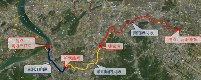 杭甬运河杭州段起于八堡船闸,终于绍兴瓦泥池东,全长约61公里,本次三级航道整治工程起自闻堰三江口,终于绍兴瓦泥池东,全长约28公里。项目是杭州市加快打造国际性综合交通枢纽城市的重要工程,也是杭州依托内河航道推动浙江实现跨越式高质量发展的重要举措。