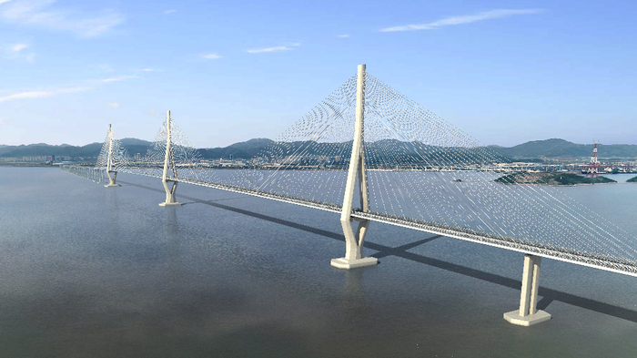 作为大型跨海连岛工程,六横公路大桥二期工程由多座桥梁及连接线构成,全线共设主线桥梁约17.76公里,其中特大桥约16.88公里,包含双屿门特大桥、青龙门特大桥两座世界级跨海大桥。其中,青龙门特大桥是世界跨度最大的三塔钢箱梁斜拉桥,双主跨756米横越大海,采用半漂浮体系设计,主塔为钻石型塔,三塔高度均为249米。