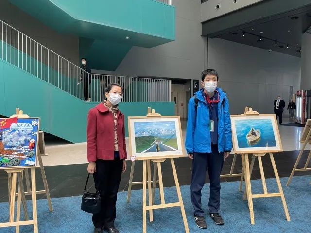 “星星向融·童心筑梦”孤独症学生书画作品巡展上,刘晶(右一)和妈妈在自己的画作前留影。