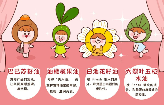 而巴巴苏籽油、白池花籽油、油橄榄果油、大裂叶五桤木油,这 4 个家伙的主要任务就是「降服」角蛋白——和角蛋白结合,减少毛躁,增加发丝的光泽感。