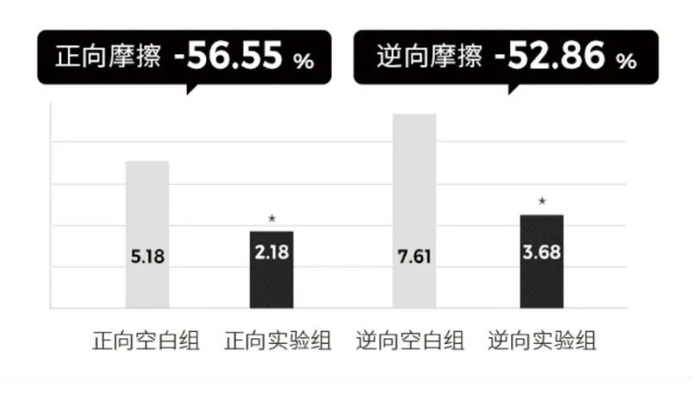 根据第三方检测机构的检测报告显示:在实验条件下,相较空白组发束,使用了飞漾护发精油的实验组发束,在高温测试实验条件下,其正向摩擦系数降低了 56.55%,逆向摩擦系数降低了 52.86%,做功量降低了 28.46%,在 5% 显著性水平下,P 值分别为 0.0006、0.0000 和 0.3484。