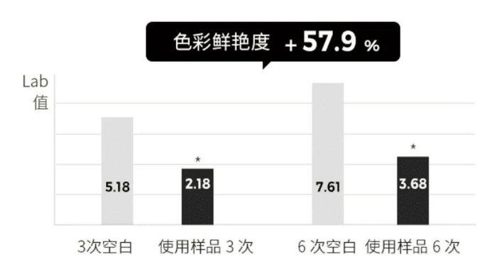 据第三方检测机构检测:在实验条件下,相较空白组发束,实验组发束第一次清洗后色差降低了 23.5%,第三次清洗后,色差降低了 57.92%,第六次清洗后色差降低了 51.64%,在 5% 显著性水平下,P值分别为 0.1558,0.027 和 0.0125。