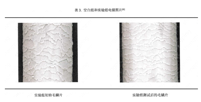 操作流程:① 采用电镜拍摄实验组发束毛鳞片初始情况;② 梳通发束;③ 称取 0.4 g 清洗液,置于圆形塑料盘内;④ 润湿发束;⑤ 将清洗液均匀涂抹于发束上,搓揉发束起泡;⑥ 反复冲洗发束至泡沫冲洗干净,梳通发束;⑦ 将实验组发束放入 50 + 1 ℃ 烘箱, 30 min 后取出;⑧ 称取 0.4 g 飞漾 FEEYAM 亮泽柔顺护发精油,置于圆形塑料盘内;⑨ 将精油均匀涂抹于烘于后的发束上;⑩ 停留 5 分钟;⑪ 采用电镜拍摄实验组发束毛鳞片使用产品后情况。