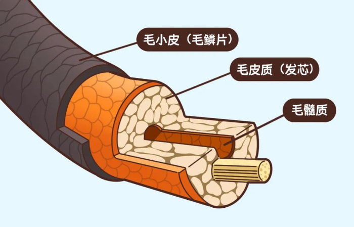 呐,如果用显微镜看我们的发丝,可以看到我们的头发是由三个部分构成的:毛鳞片、毛髓质、发芯。