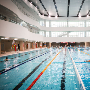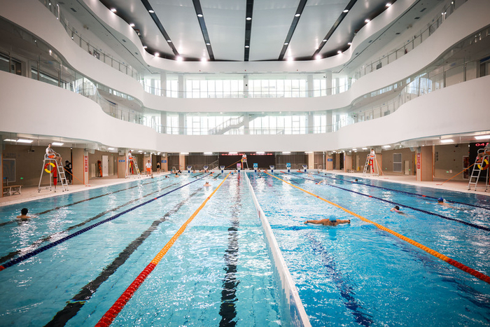 8根50米的标准泳道,依稀还有熟悉的记忆,而全新设计的空间,给泳客带来更丰富的游泳体验。游泳池置身于挑高16.85米的中庭区域,原本泳池端头封闭的墙体被改造成完整的落地玻璃幕墙,引入更多自然光线。透过玻璃窗,还能看到八万人体育场的一角,内外空间实现连接,视觉广度得以延伸。
