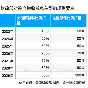 文件显示,电池中含有的适用关键矿物,需要有一定的价值比例在美国或与美国有自由贸易协定的国家提取或加工,或在北美回收。2023年,这一比例是40%,从2024年起逐年提升10个百分点,到2027年,适用的百分比为80%。