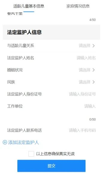 (4)若需要添加法定监护人信息,点击【添加监护人】即可新增一条监护人信息,一个适龄儿童最多可填写两位法定监护人信息,法定监护人信息完善方可提交。如下图所示: