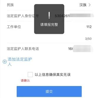 每条信息均已填报完整才可提交,请法定监护人如实填写报名系统中的所有信息,保证信息真实、有效。填写虚假信息、提供伪造证件,一经查实,取消适龄儿童在该校区报名及入学资格,相关人员移交公安部门处理。