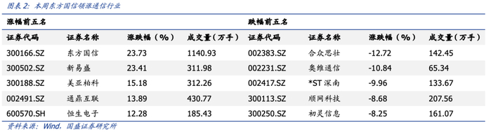 本周受益ChatGPT概念,东方国信上涨23.73%,领涨板块。受益光通信概念,新易盛上涨23.41%,受益阿里巴巴概念,美亚柏科上涨15.18%,受益光通信概念,通鼎互联上涨13.89%,受益阿里巴巴概念,恒生电子上涨12.28%。