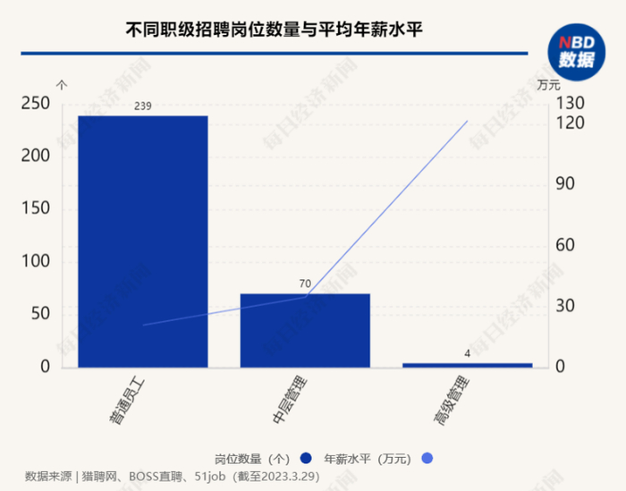 记者按“普通员工”“中层管理”和“高级管理”三种职级统计发现,三个招聘网站最近1个月招聘信息中,普通员工等级的招聘数量最多,为239个,平均年薪20.92万元;其次,中层管理人员为70个,平均年薪34.71万元;在招高管数量最少,仅有4个,平均年薪为121.88万元。