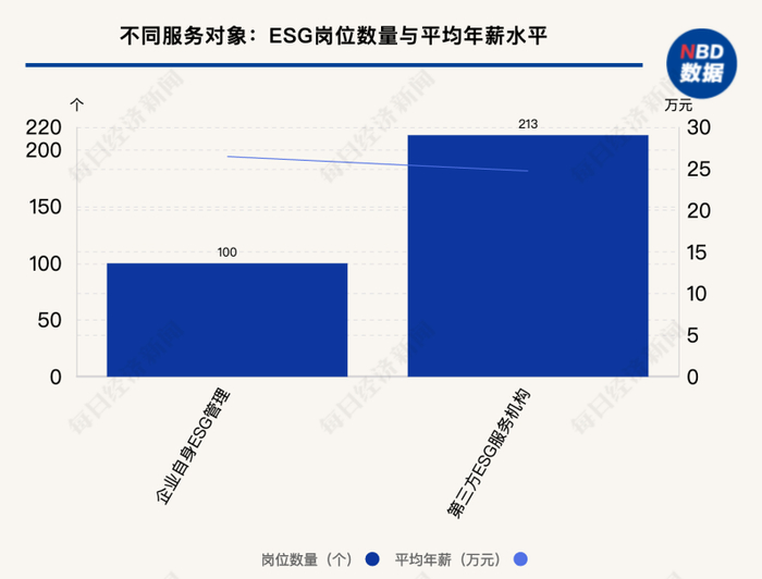 《每日经济新闻》记者按服务对象将ESG岗位再分为两类:一类是企业自身ESG管理,另一类是第三方ESG服务机构。前者的岗位数量达到100个,平均年薪为26.47万元;后者的岗位数量为213个,平均年薪为24.74万元。