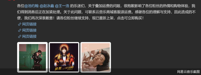 与此同时,云音乐商城也通过官方账号发文回应,关于叠加运费的问题,正在加紧处理,可联系云音乐商城客服退运费,三张专辑已重新上架。