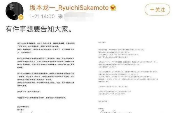 2021年1月21日,坂本龙一在社交平台告知大家,于日前被确诊为直肠癌。为什么说是再度呢?曾在2014年时,坂本龙一就被查出不幸患上咽喉癌,在此后长达6年的时间里,他顽强地和病魔抗争,随着积极的治疗,病情逐步缓解,也恢复了正常的生活,可没想到了厄运却再一次降临在他的身上。