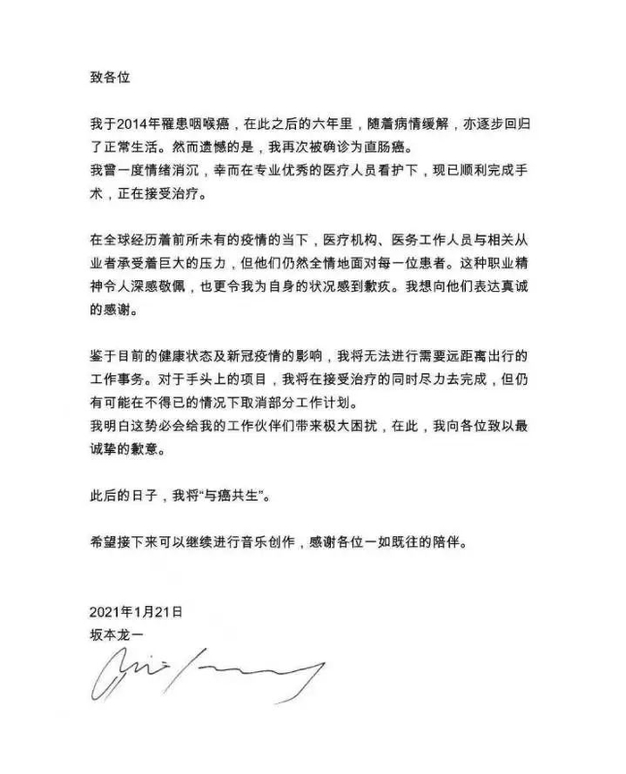 2014年,坂本龙一曾患上咽喉癌,病情在六年时间里逐步缓解,他也逐渐回归正常生活。然而2021年他再次确诊直肠癌。虽然当时一度情绪消沉,但已经顺利完成手术,接受了治疗。他表示,此后的日子,将“与癌共生”。