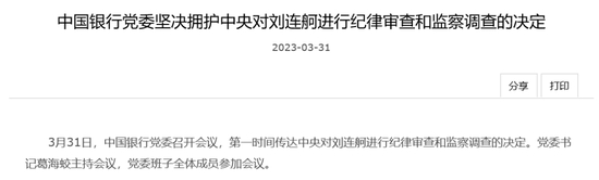 3月31日,中央纪委国家监委发布消息,中国银行原党委书记、董事长刘连舸涉嫌严重违纪违法,目前正接受中央纪委国家监委纪律审查和监察调查。