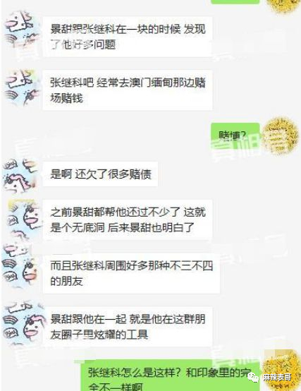爆料还指出张继科还找了景甜借了不少钱。而且景甜帮他还过不少,但后知后觉是个无底洞。市场传闻,景甜替张继科还了上千万的赌债。。。