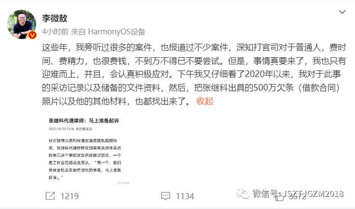 声明发出来几个小时,李微敖又发文,说得更为详细,说有三条视频一张截图,张继科还欠了500万,有借条。