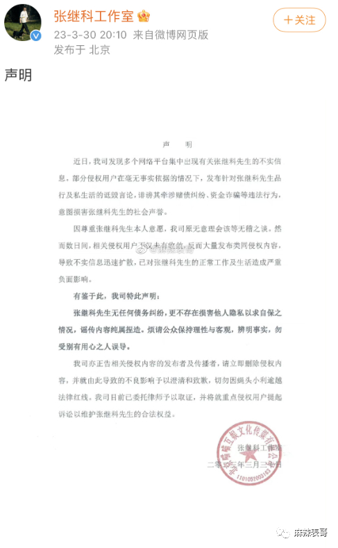 31号晚上20点10分,张继科工作室再次发声明,说没有任何债务纠纷。